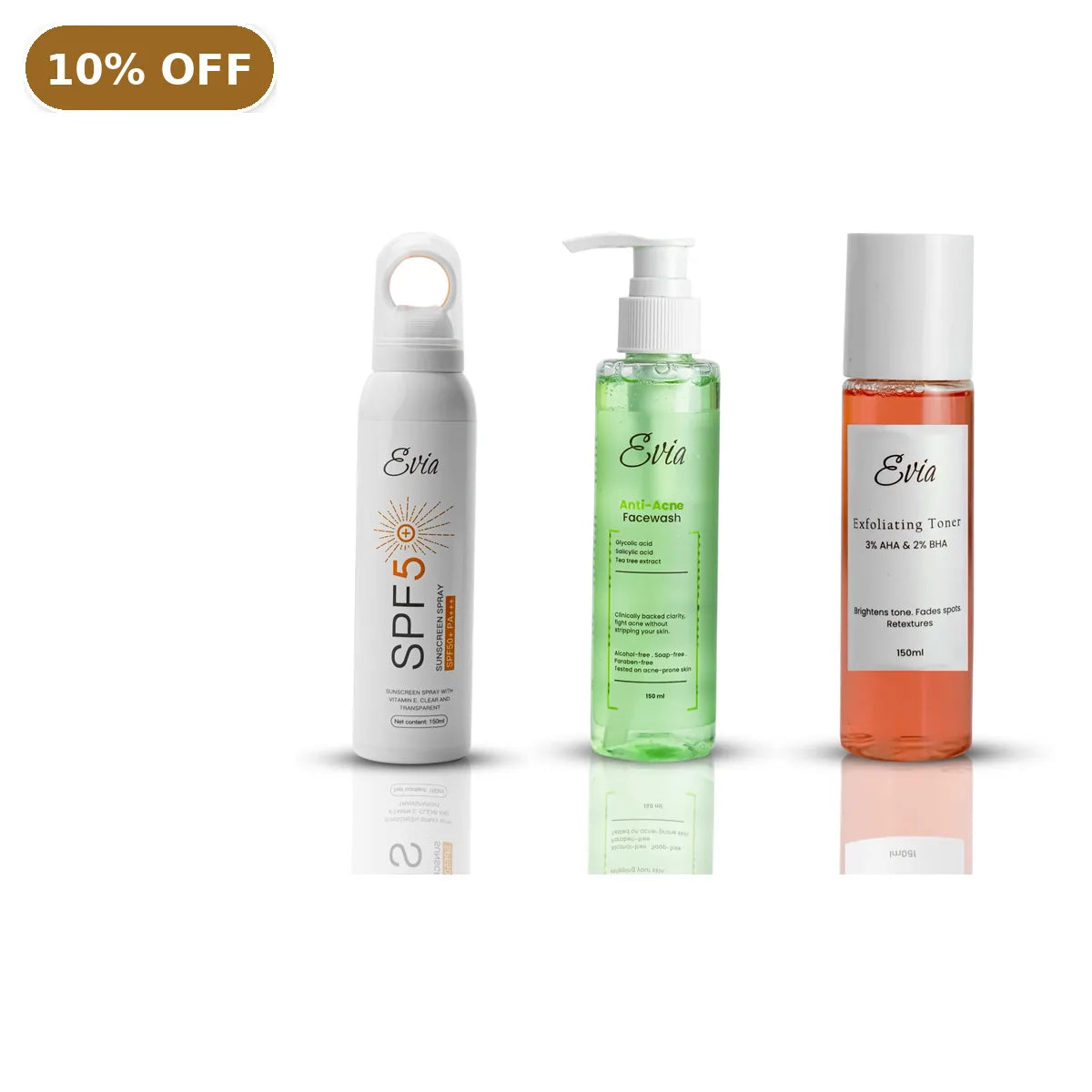 Anti-Acne Facewash + Exfoliating AHA/BHA Toner + Sunblock Spray